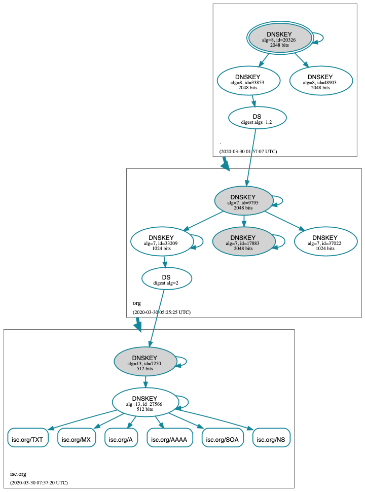 the DNS hierarchy; the trustworthiness of each zone is guaranteed by