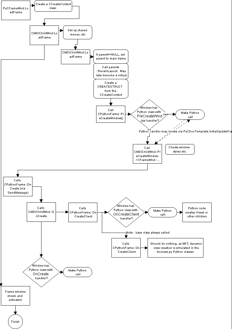 The second diagram shows the flow through the "LoadFrame()" call, during which the windows and views are created. This is usually done by Python during the "OpenDocumentFile" process shown first. It is in a separate diagram to keep the sizes manageable!